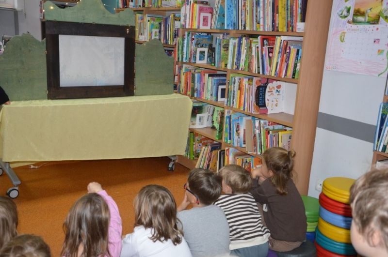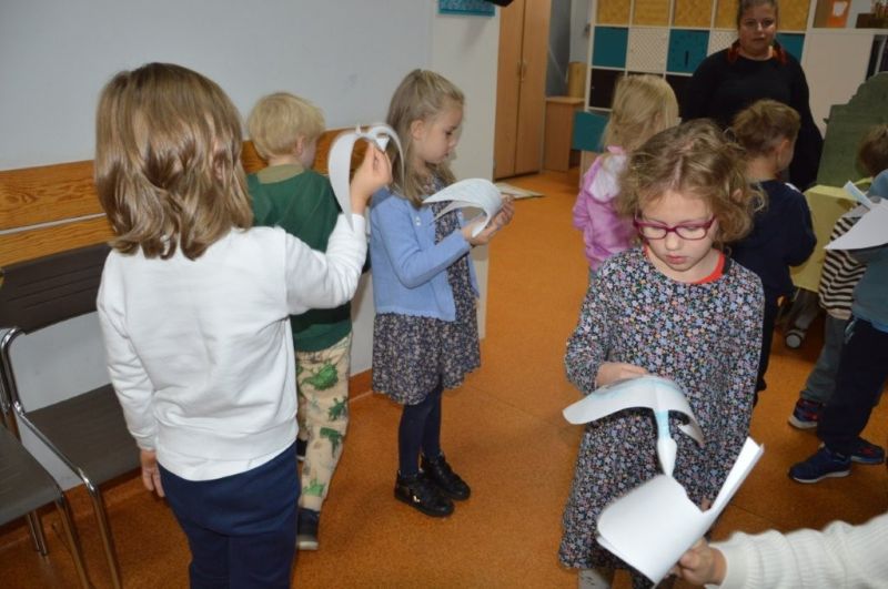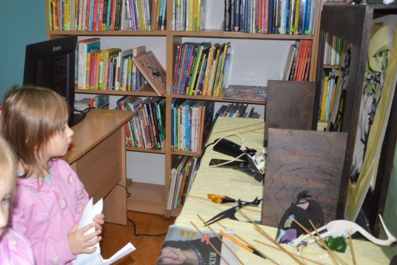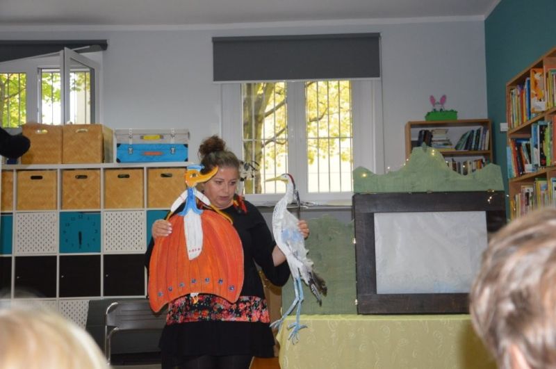 Smyki obejrzały spektakl pt. "Żuraw i lisica" przygotowany przez panie bibliotekarki i wykonały modele lecących żurawi.