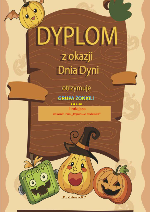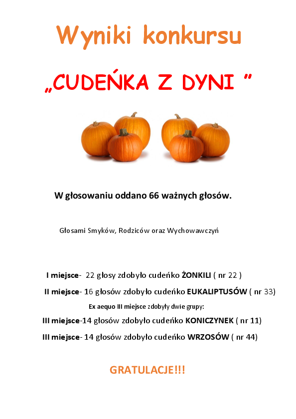 28 października Smyki cały świat widziały na pomarańczowo! Na finał październikowych zabaw z dynami zaplanowane było rozstrzygniecie konkursu na " Dyniowe cudeńka". Wszystkie grupy wspaniale pracowały i bawiły się z tymi pożywnymi owocami - czego rezultaty podziwialiśmy na wystawie konkursowej. Brawa dla wszystkich laureatów!