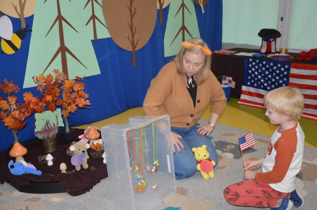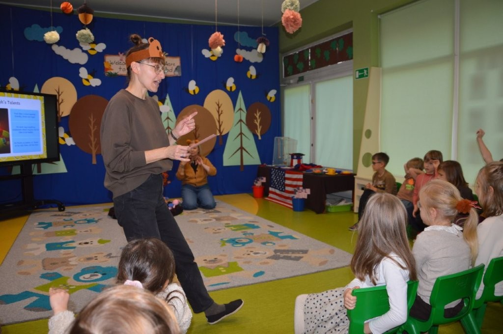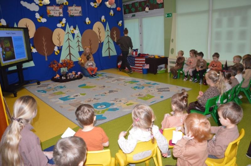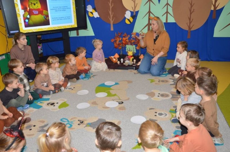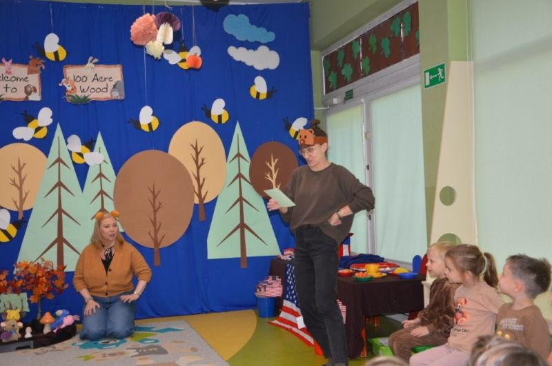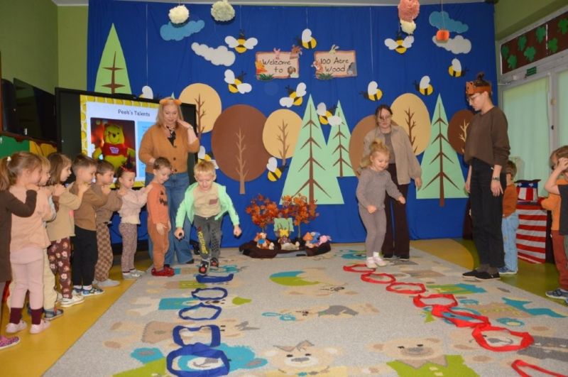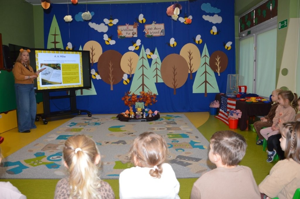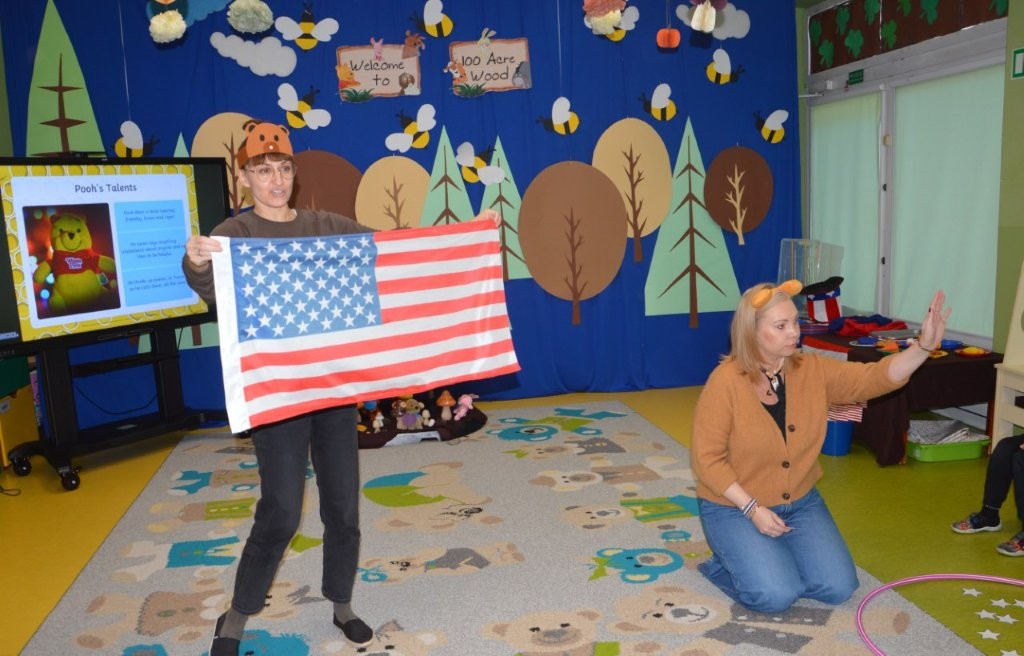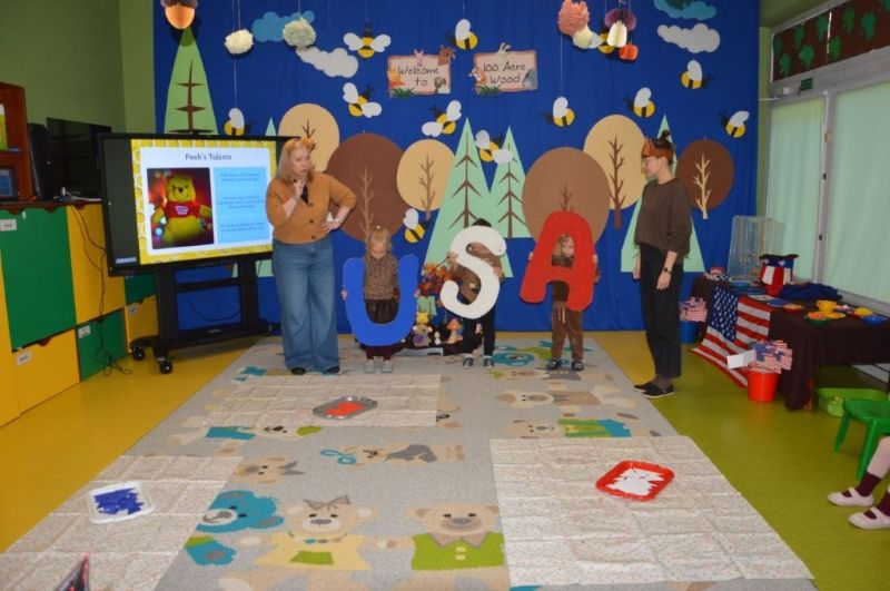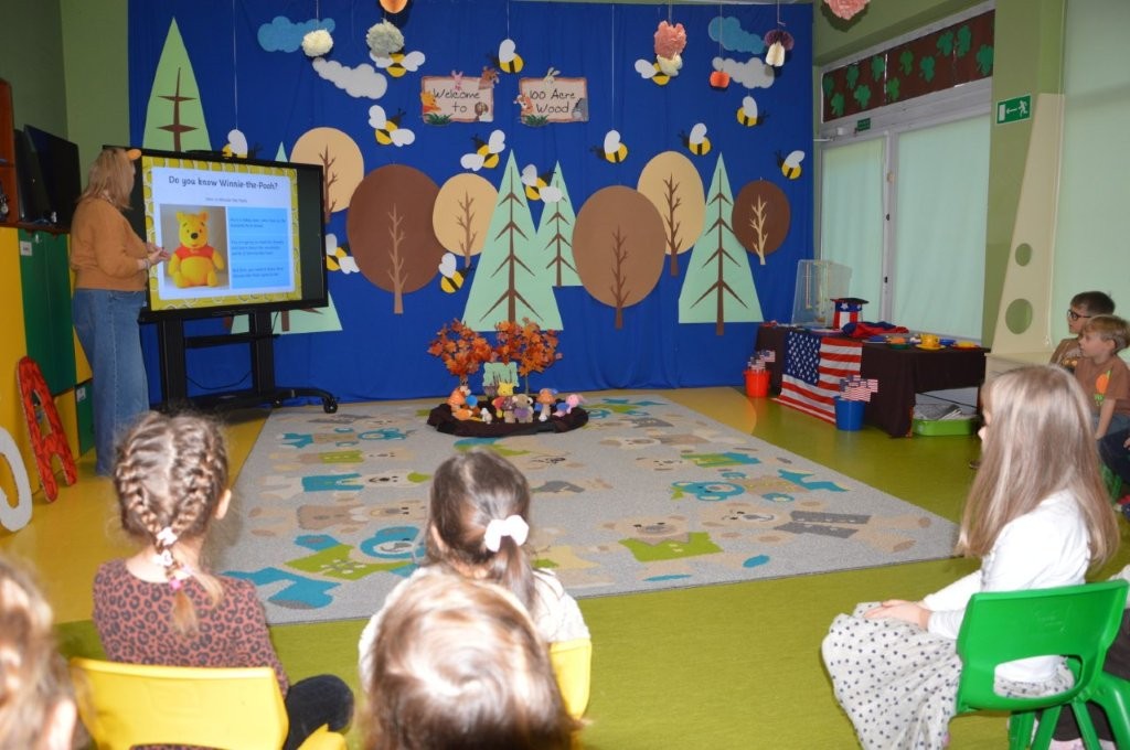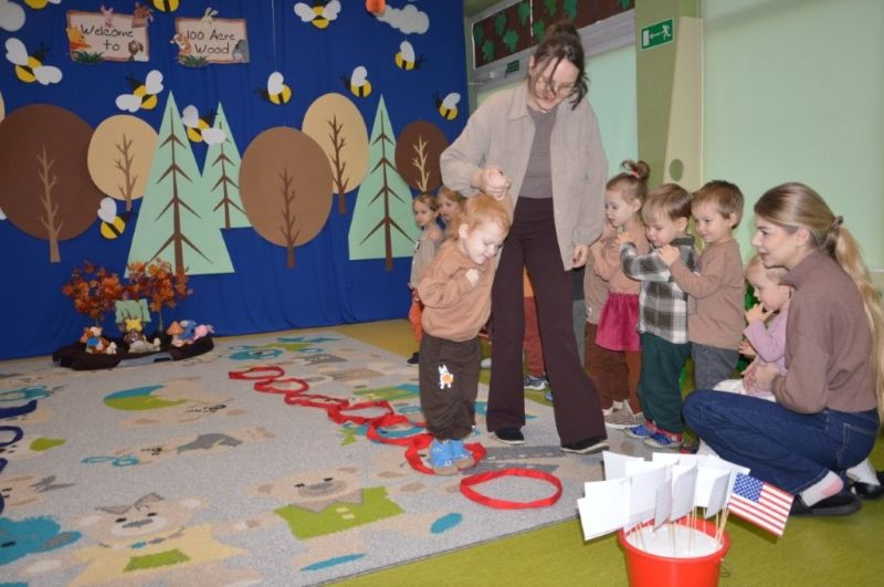 Podczas zabaw z misiami dzieci miały możliwość poznania kraju leżącego daleko od Polski, w którym językiem urzędowym jest język angielski. Przewodniczkami po tym rozległym i pięknym państwie były Panie Angliski: Kasia i Asia, a mięciutkich przyjaciół teddy bear (rodowitego Amerykanina) tj. Kubusia Puchatka, Prosiaczka, Tygryska,...