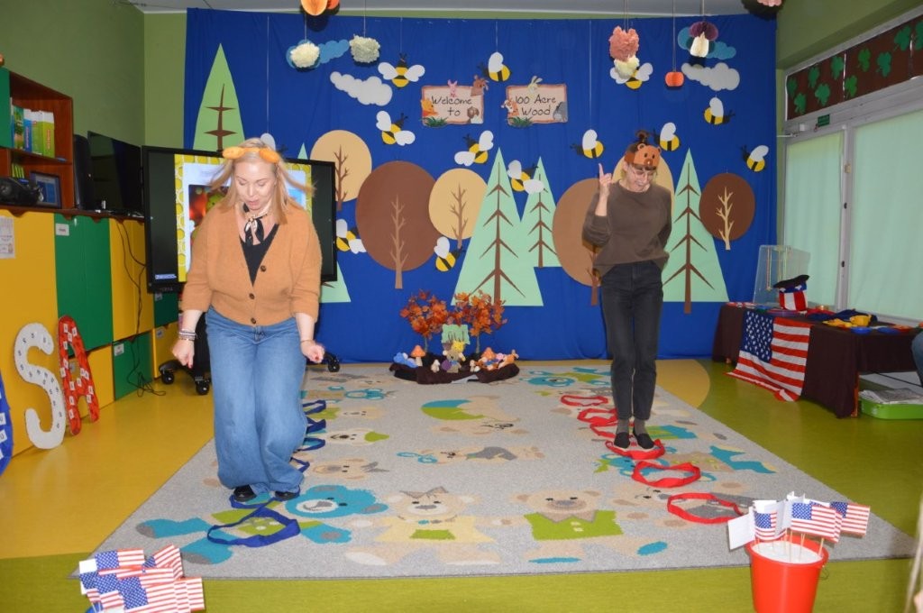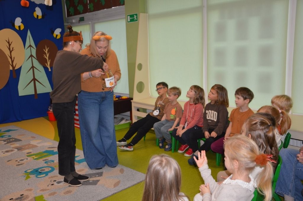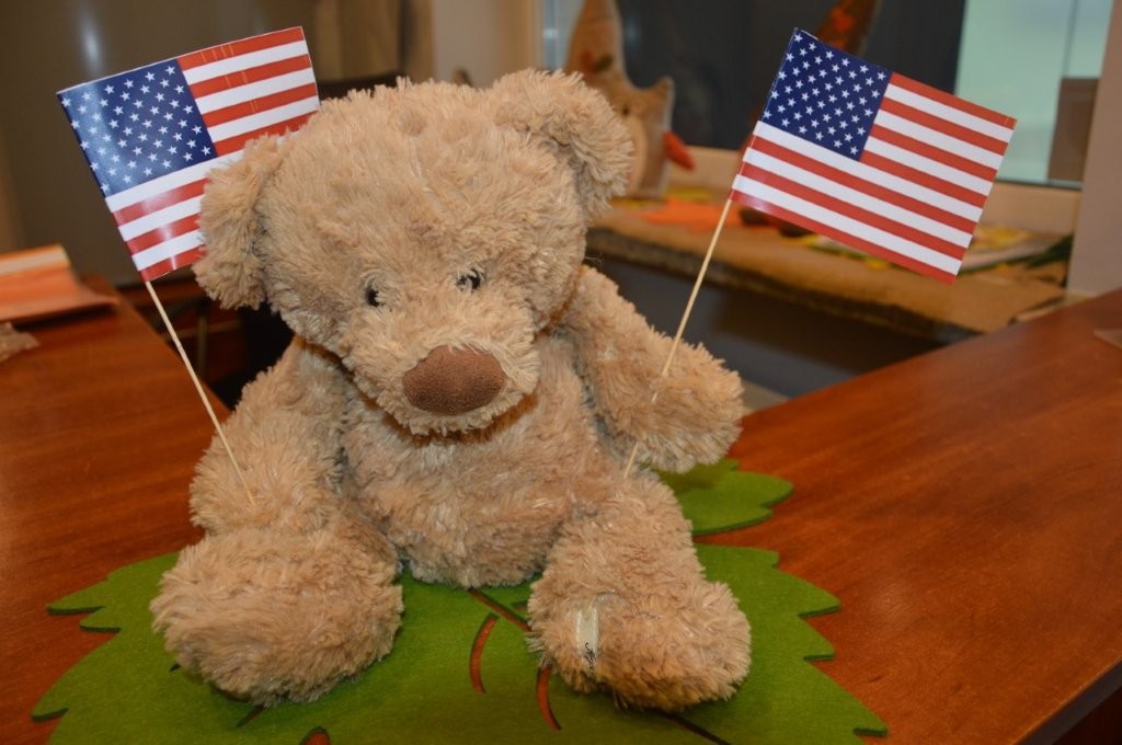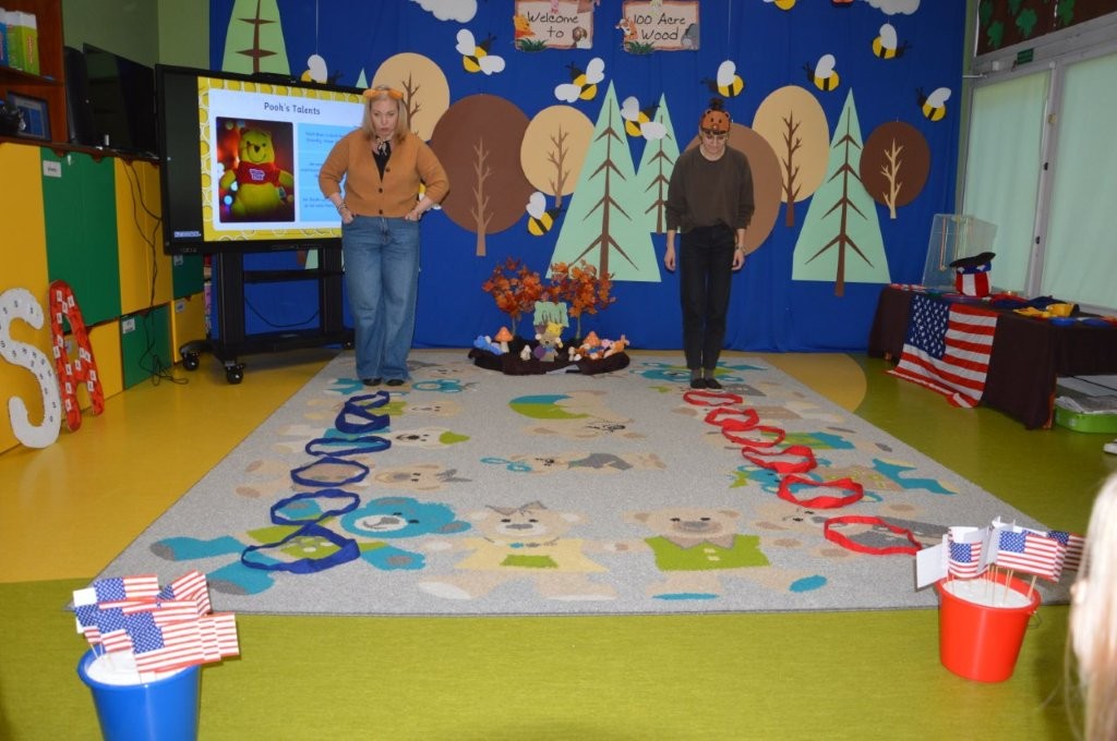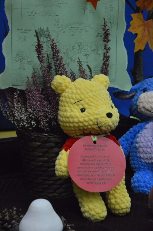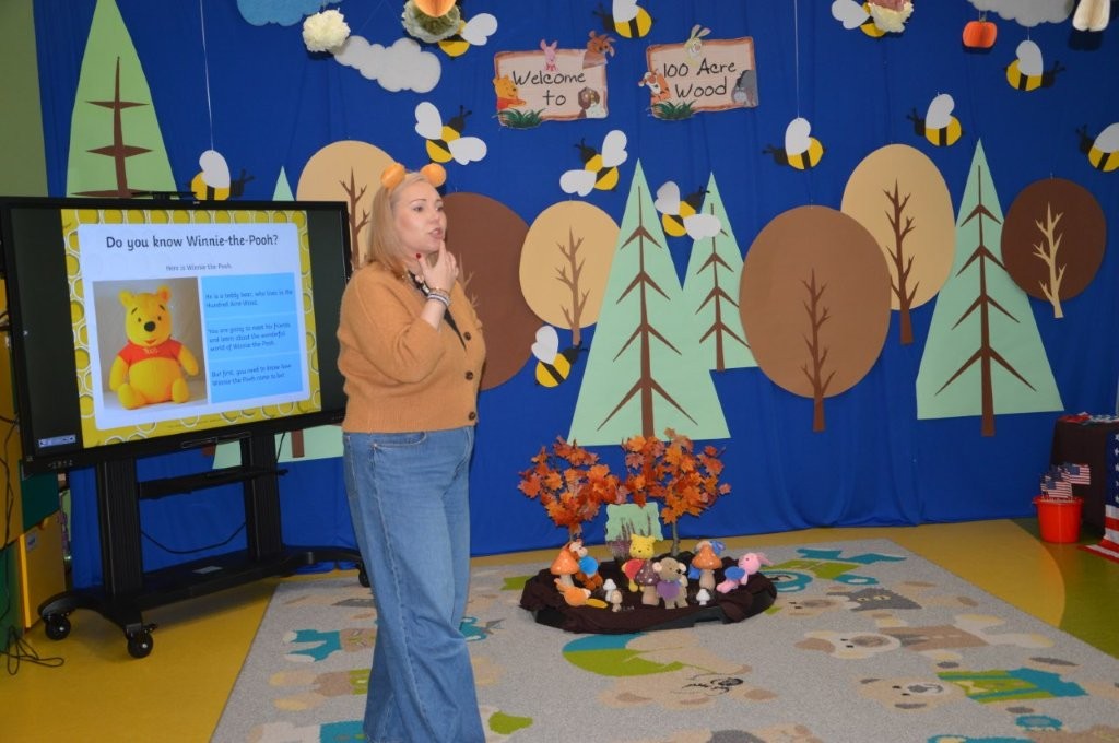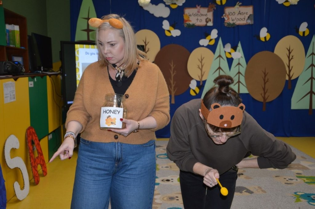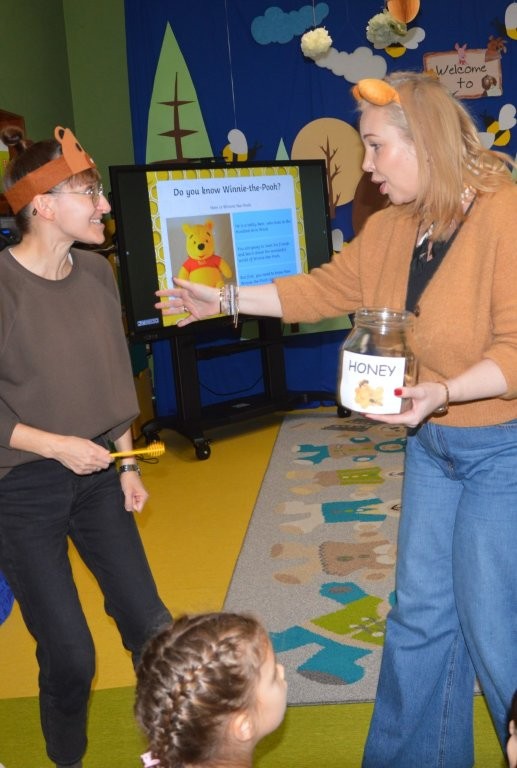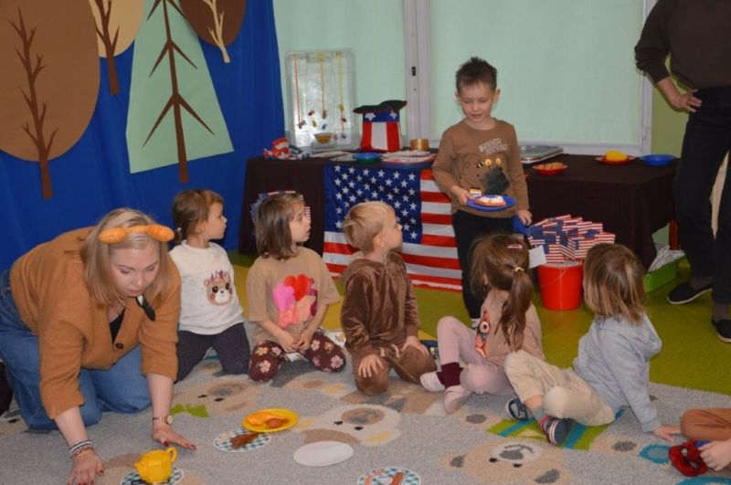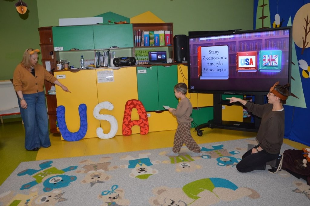 Podczas zabaw z misiami dzieci miały możliwość poznania kraju leżącego daleko od Polski, w którym językiem urzędowym jest język angielski. Przewodniczkami po tym rozległym i pięknym państwie były Panie Angliski: Kasia i Asia, a mięciutkich przyjaciół teddy bear (rodowitego Amerykanina) tj. Kubusia Puchatka, Prosiaczka, Tygryska,...
