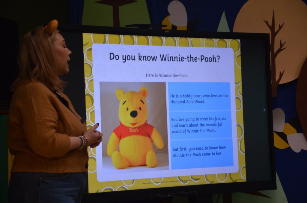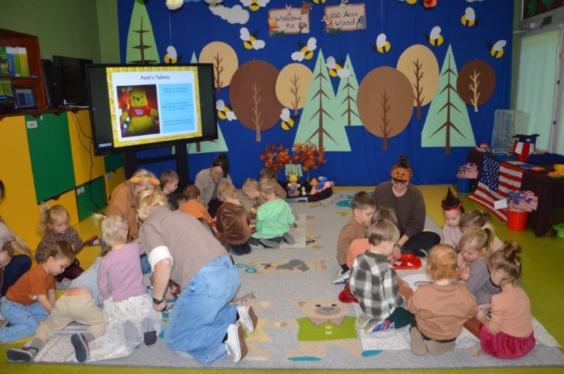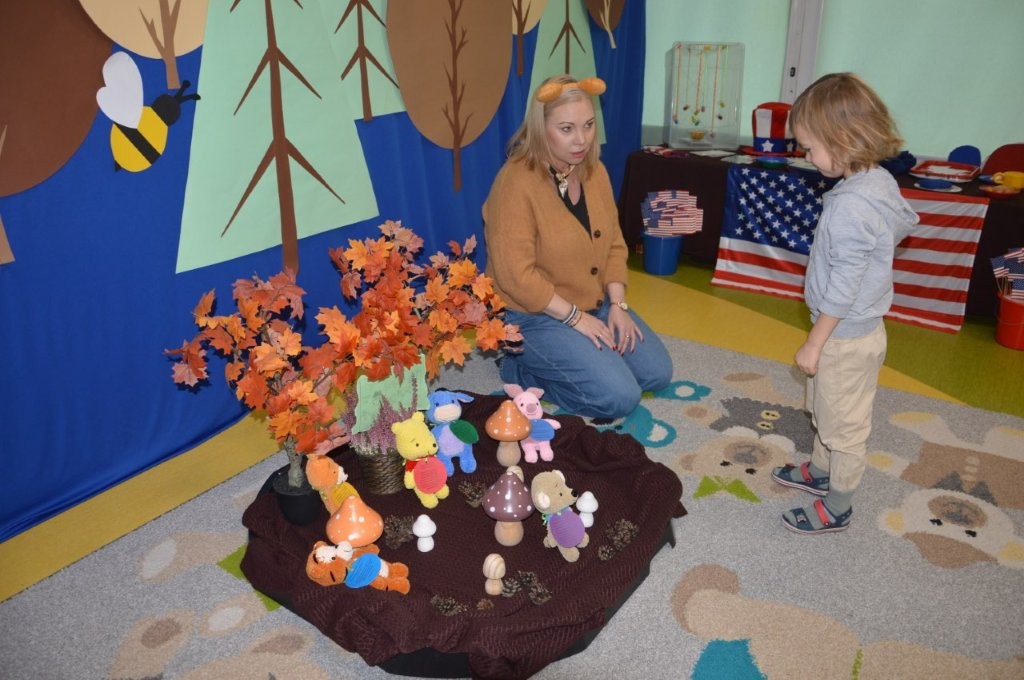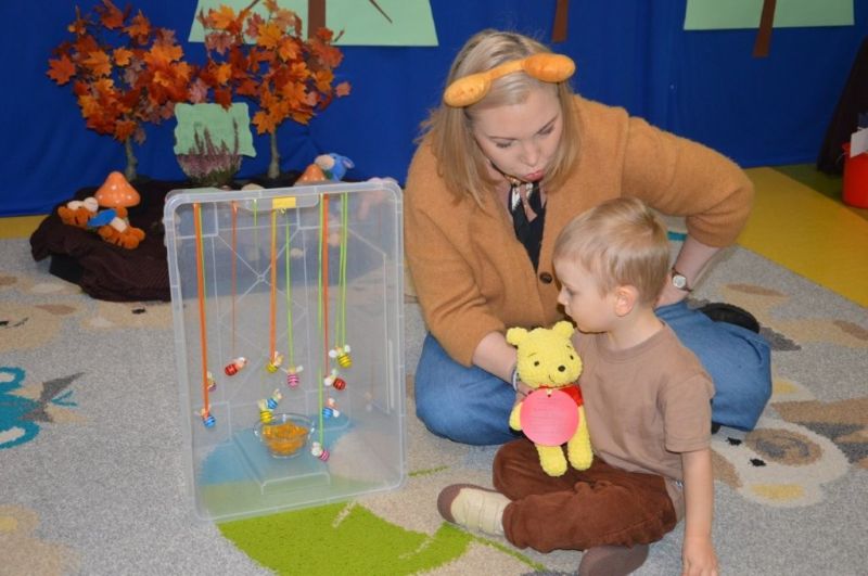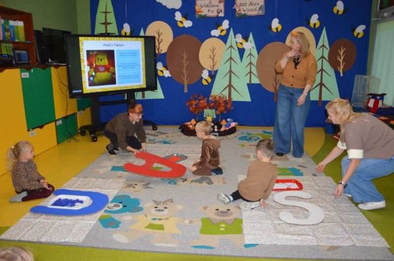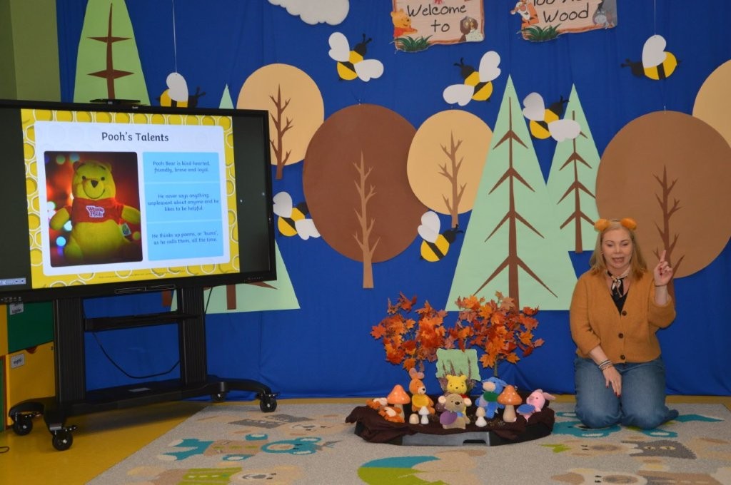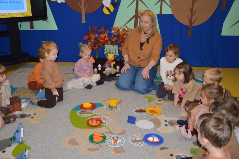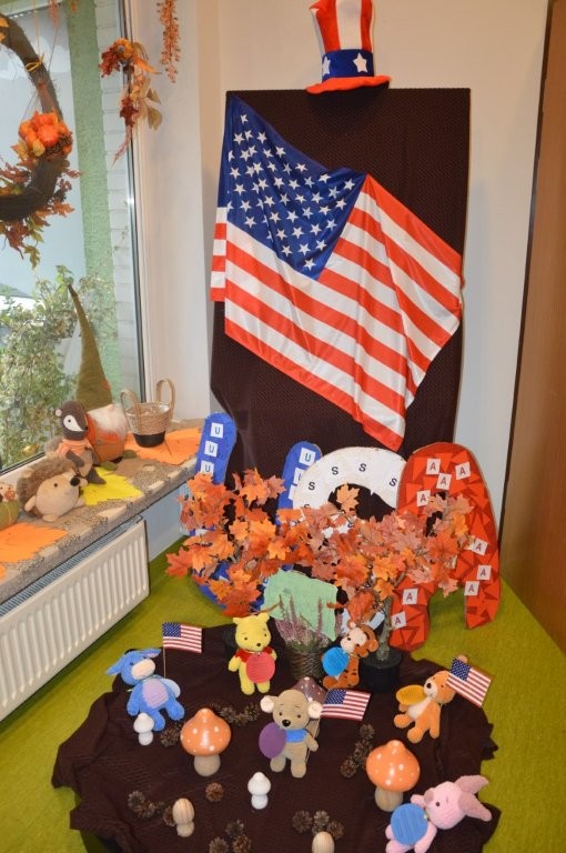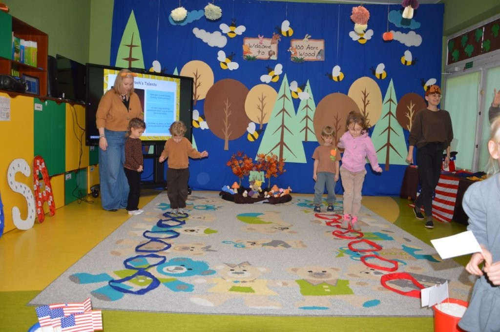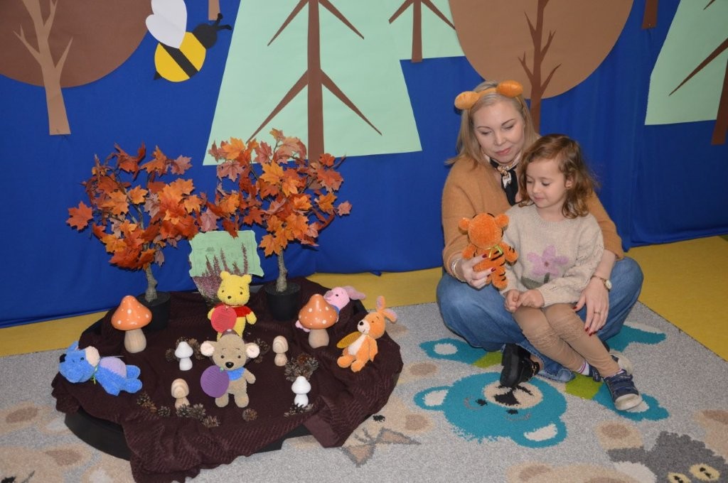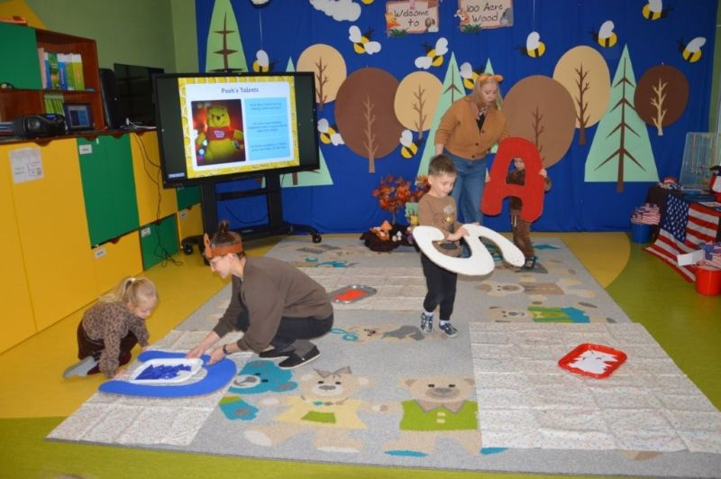 Podczas zabaw z misiami dzieci miały możliwość poznania kraju leżącego daleko od Polski, w którym językiem urzędowym jest język angielski. Przewodniczkami po tym rozległym i pięknym państwie były Panie Angliski: Kasia i Asia, a mięciutkich przyjaciół teddy bear (rodowitego Amerykanina) tj. Kubusia Puchatka, Prosiaczka, Tygryska,...