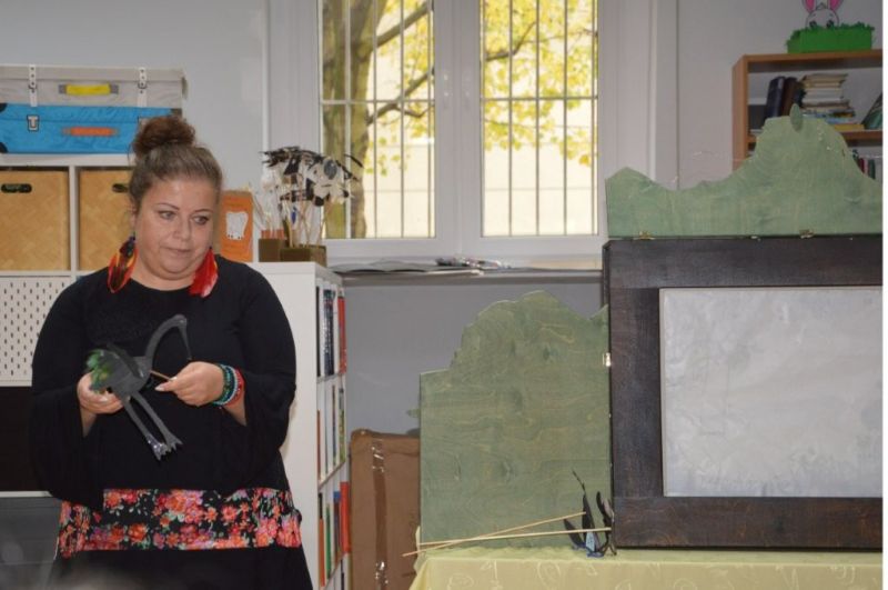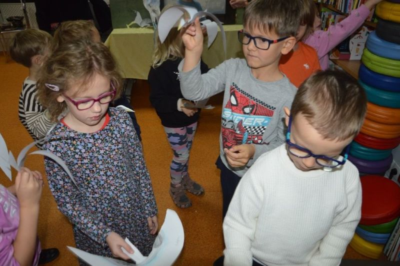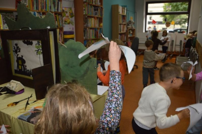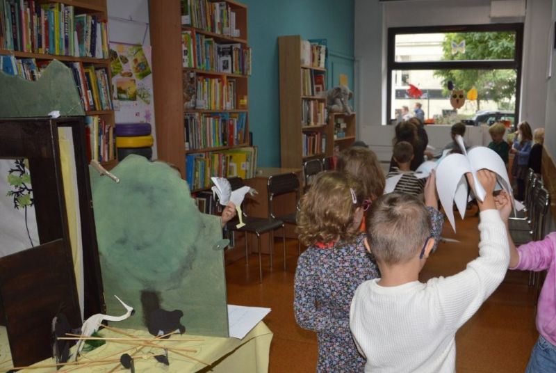Smyki obejrzały spektakl pt. "Żuraw i lisica" przygotowany przez panie bibliotekarki i wykonały modele lecących żurawi.