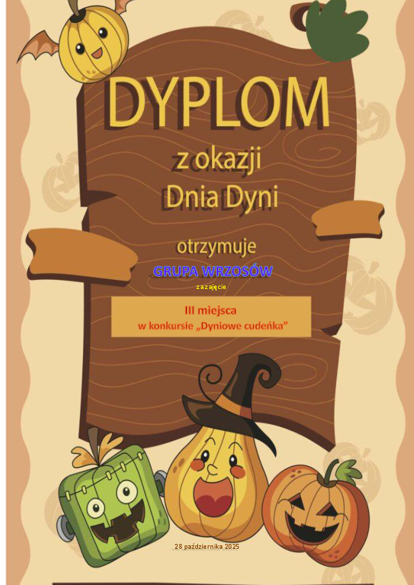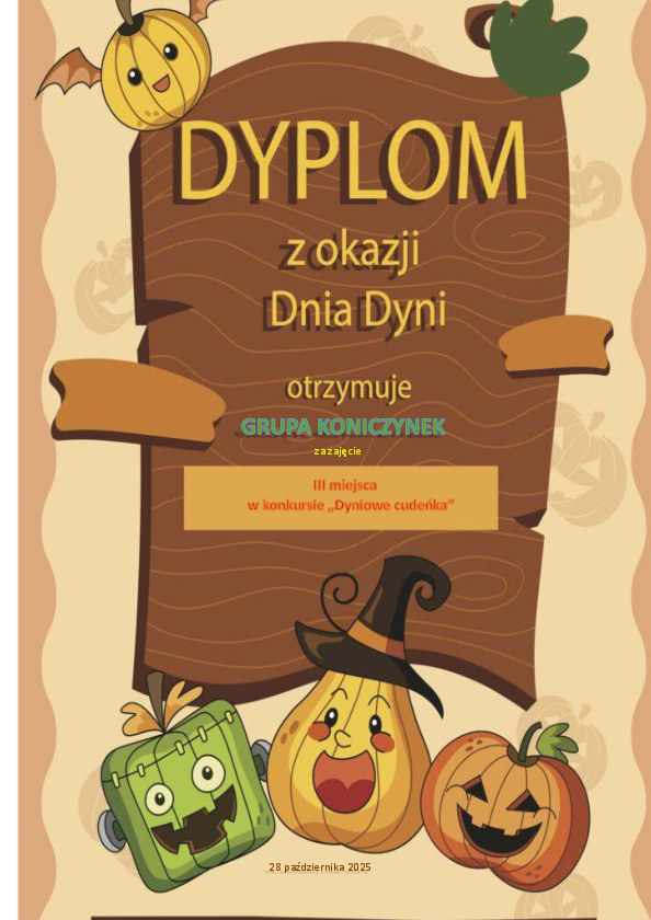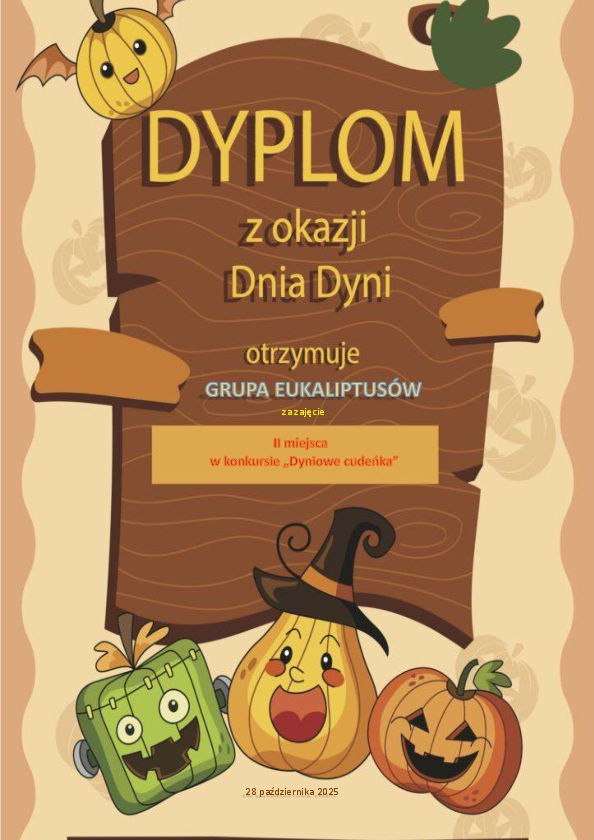 28 października Smyki cały świat widziały na pomarańczowo! Na finał październikowych zabaw z dynami zaplanowane było rozstrzygniecie konkursu na " Dyniowe cudeńka". Wszystkie grupy wspaniale pracowały i bawiły się z tymi pożywnymi owocami - czego rezultaty podziwialiśmy na wystawie konkursowej. Brawa dla wszystkich laureatów!