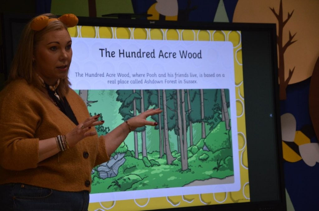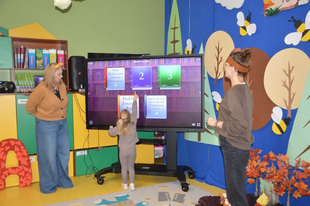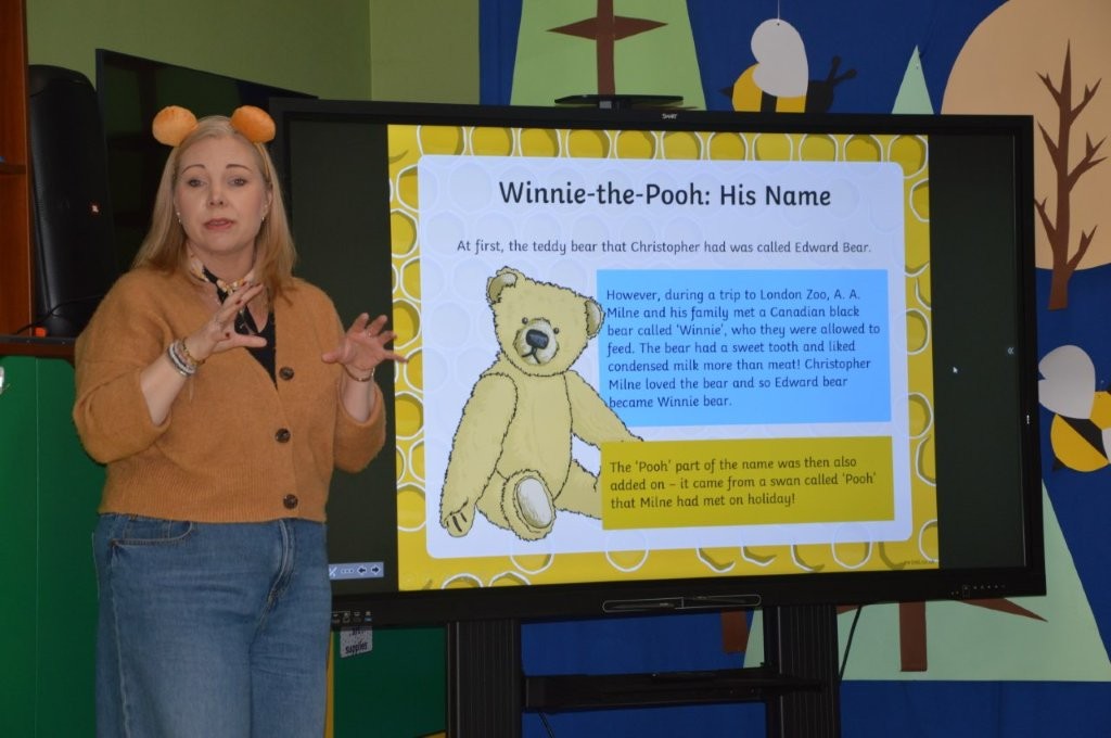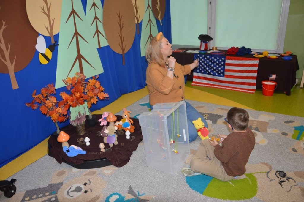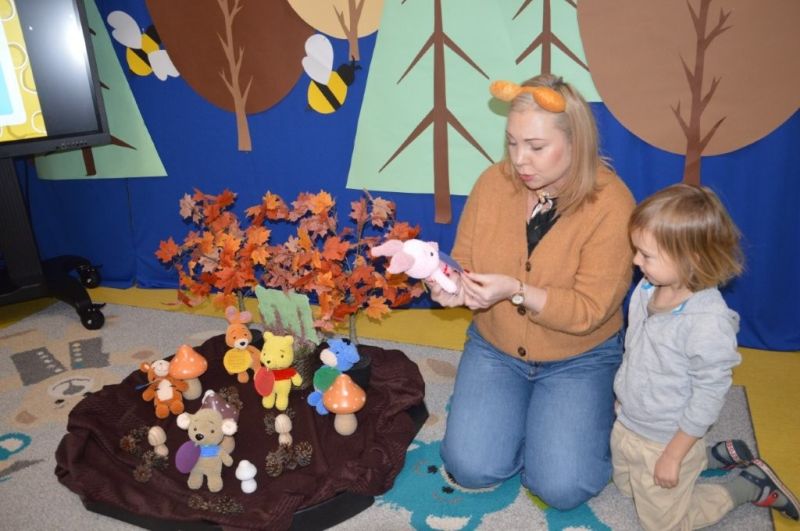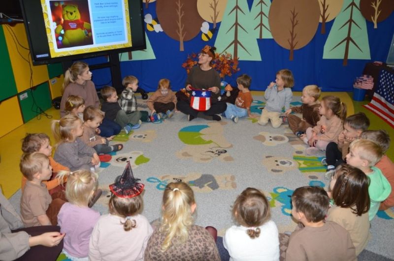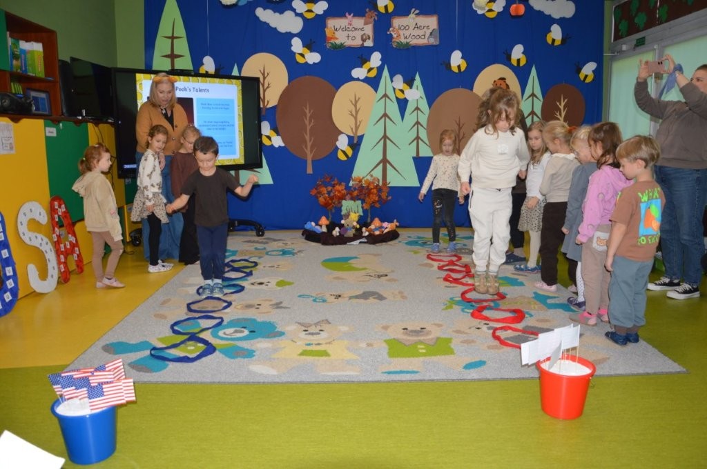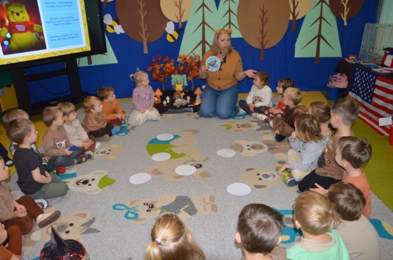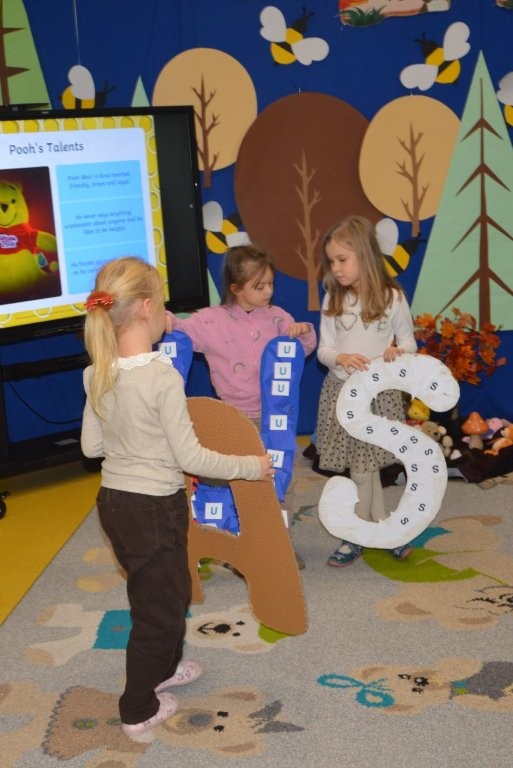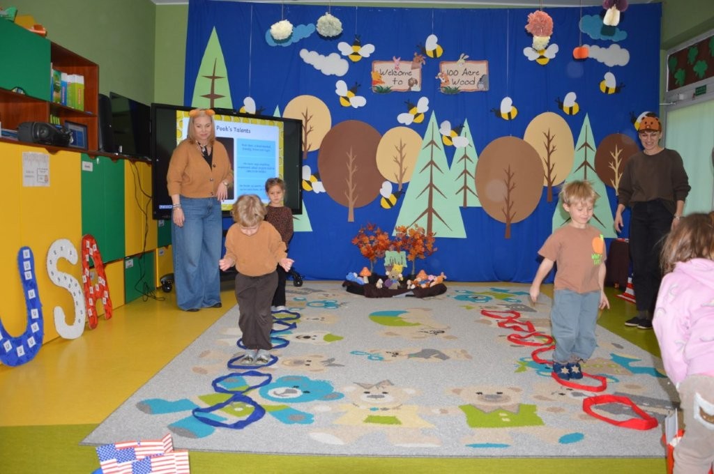 Podczas zabaw z misiami dzieci miały możliwość poznania kraju leżącego daleko od Polski, w którym językiem urzędowym jest język angielski. Przewodniczkami po tym rozległym i pięknym państwie były Panie Angliski: Kasia i Asia, a mięciutkich przyjaciół teddy bear (rodowitego Amerykanina) tj. Kubusia Puchatka, Prosiaczka, Tygryska,...